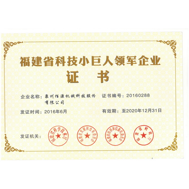 福建省科技小巨人領(lǐng)軍企業(yè)證書