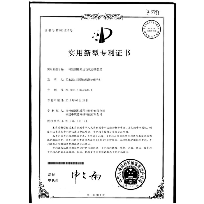 新型-泉州佰源機械科技股份有限公司 一種大圓機大盤齒輪的脈沖微調(diào)結(jié)構(gòu) 實用新型專利證書